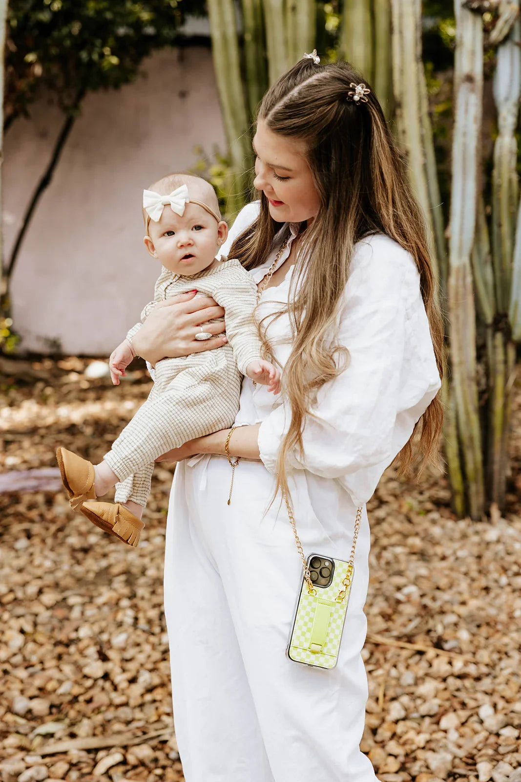 Case Design: White and lime green checkered pattern Finger Strap Color: Solid lime green