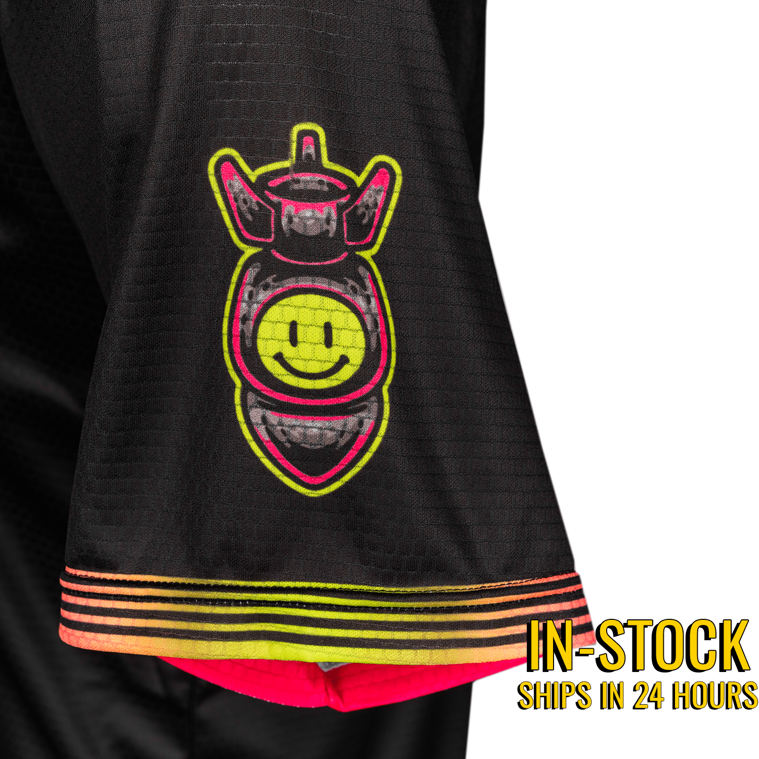 This in-stock full-button baseball jersey features a black base color neon yellow and neon pink stripes and text, the friendly nuke on the left sleeve, and the #99.
