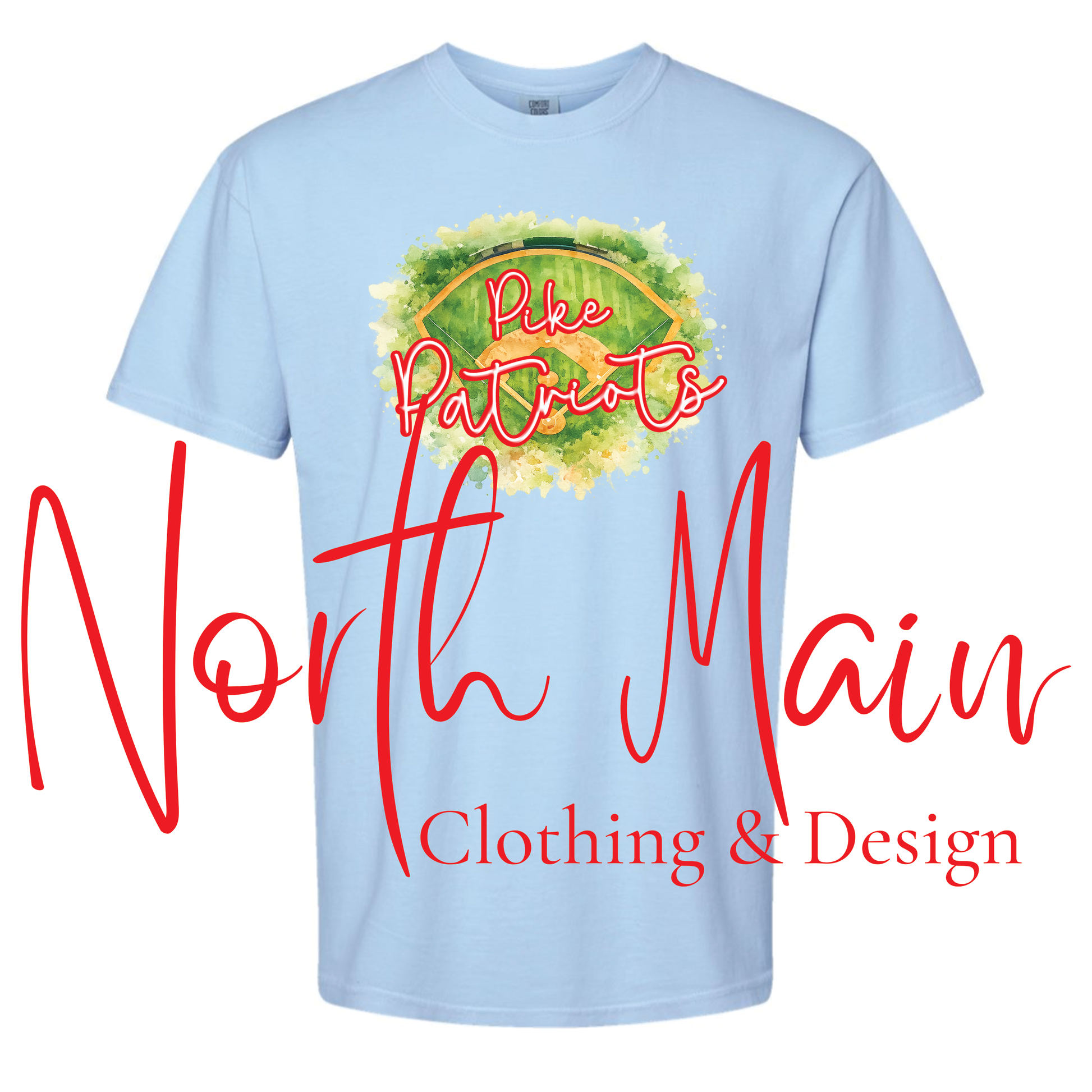 Show your team spirit in style with this beautifully designed watercolor field tee! Featuring a vibrant ballfield graphic with your school name and mascot in bold script across the center, this design blends classic sports pride with a soft, artistic touch.