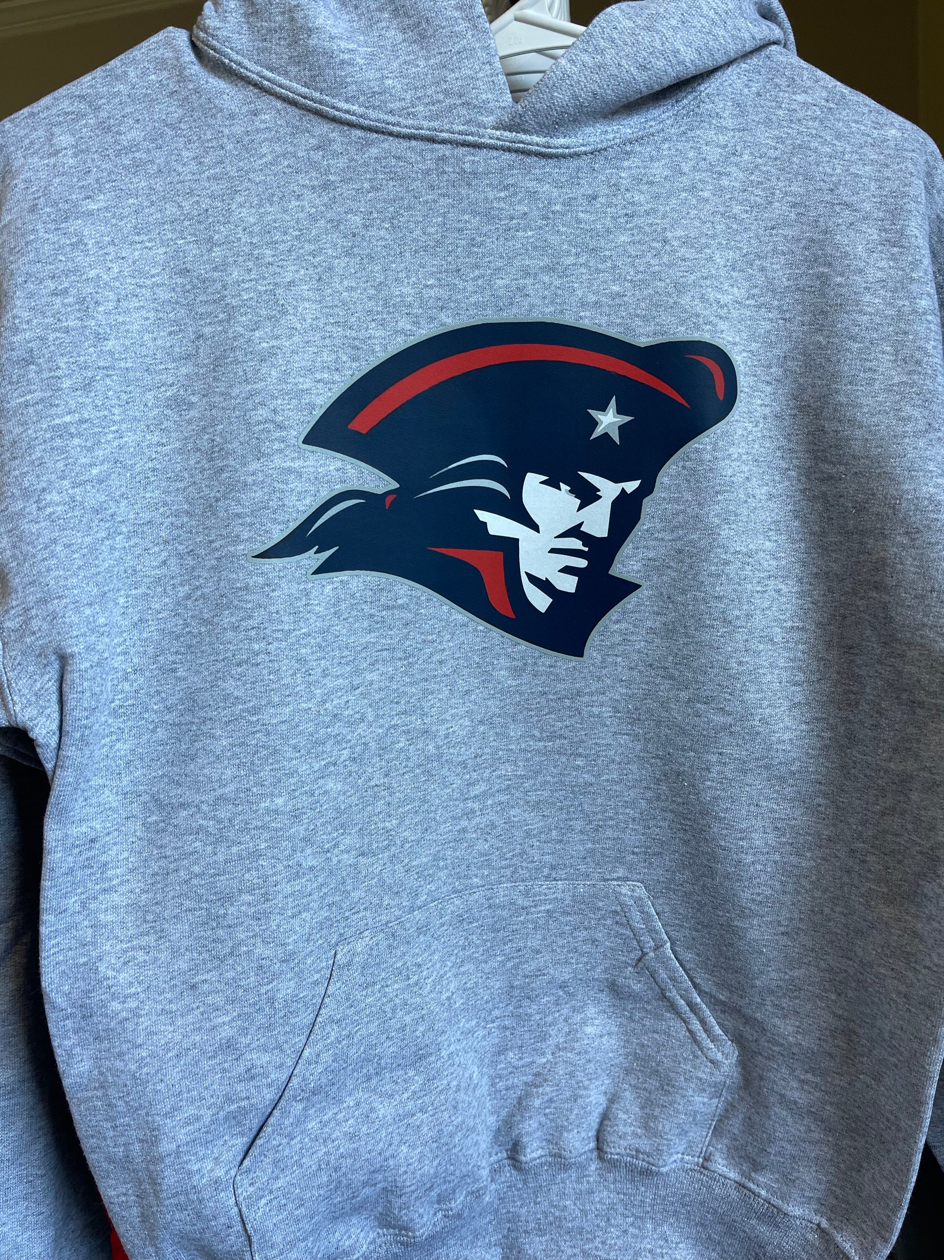 Youth athletic heather hooded sweatshirt and jogger sweat pant set with your school's logo/mascot on both sweatshirt and pants.